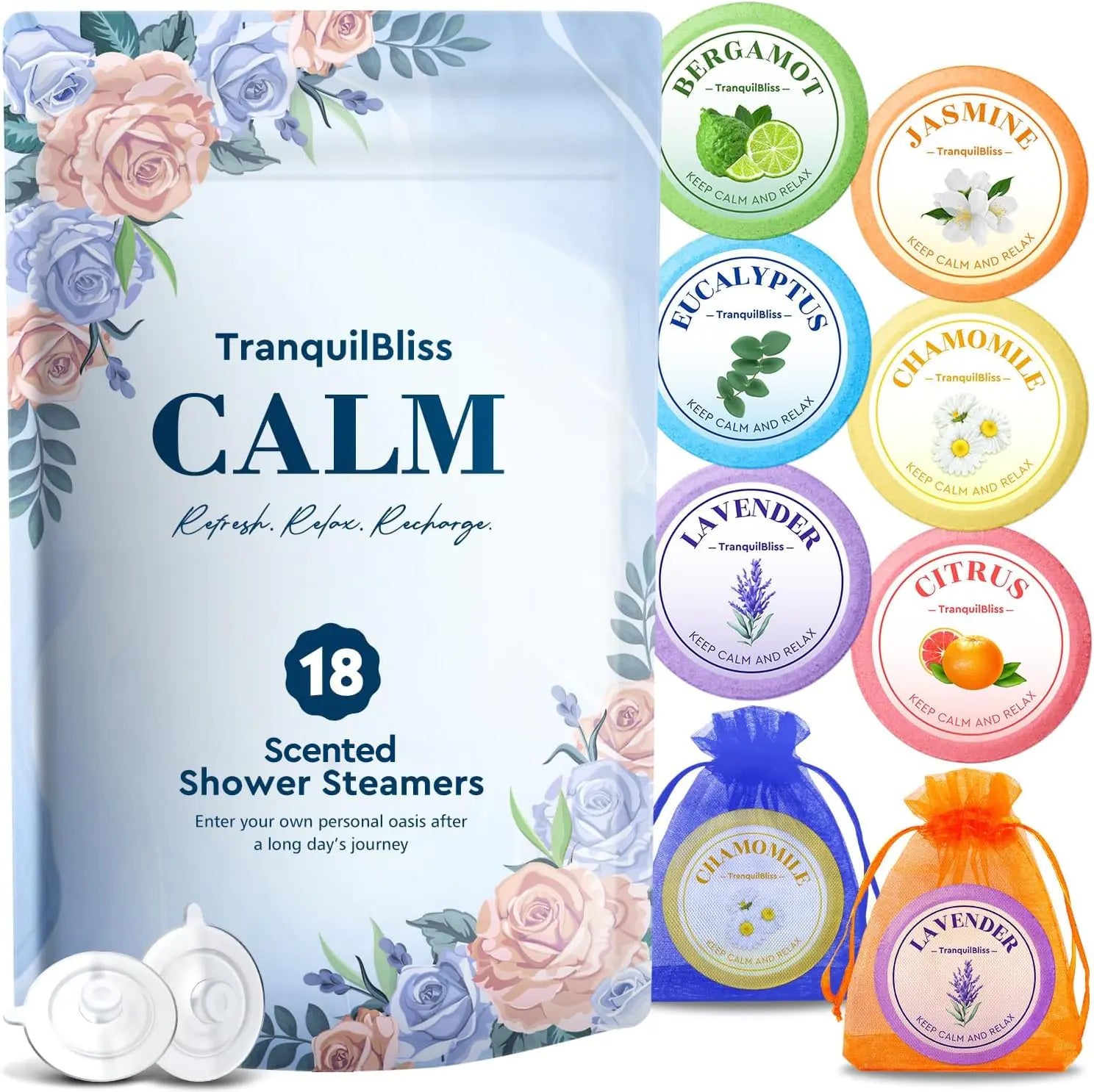 [[Good Idea for Sharing] TranquilBliss shower steamers are designed with exquisite packaging and affordable quantities and each shower steamer comes in a separate plastic package. These shower tablets can turn any shower into a wonderful experience with a pleasant aroma. On Christmas Thanksgiving Valentine’s Day Mother’s Day or birthdays this is definitely a thoughtful thing to pamper your wife mother friends parents husband or children. [Easy to Use] TranquilBliss shower steamer is convenient to use with three steps: First remove the individual foil wrap from the shower steamer; then place it on the floor but avoid heavy stream from flushing on it directly and don’t submerge it; finally let hot or cold splashes of water activate the shower steamer when you are taking a shower. [Multi-use Design] In addition to using our shower steamer when taking a shower you can also use it as an air freshener. With the equipped 2 suction cups and 2 mesh net bags you can hang them on the wall and they will emit a fragrance. They can refresh the air in many places such as bedroom bathroom living room etc. In addition you can also put them in the car the scent of the shower steamer will make your car rides have a nice aroma. [Safe Ingredients] Our shower steamers for women are different from others using an all mild formula that extracts from fruits and plants for concentration resulting in a longer and stronger fragrance. Our shower bomb’s pure ingredients are safe and will emit a pleasant aroma. [Long-lasting 6 Fragrances Dissolve Cleanly] There are 6 different and long lasting scents of shower steamers in one package: bergamot jasmine eucalyptus chamomile lavender and citrus; 3 for each fragrance. Each fragrance gives you a different experience. Made from pigments extracted from plant there will be no residue after your bath and it will be easy to rinse. NO need to worry about cleaning the bathroom after taking the shower.]